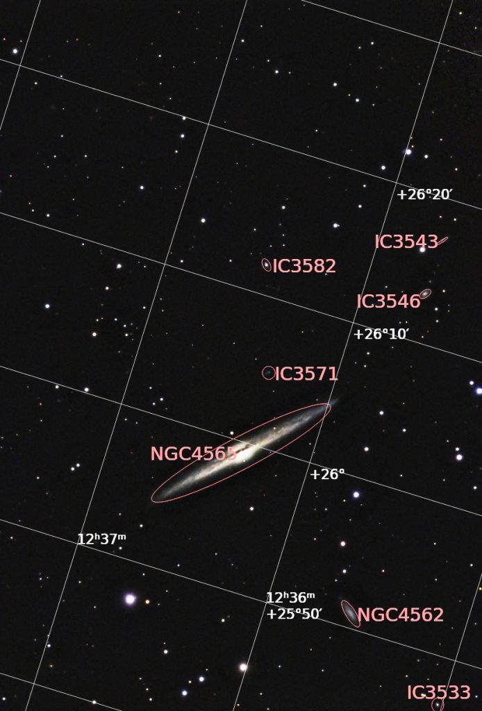 NGC 4565 ist eine helle Spiralgalaxie im Sternbild Haar der Berenike am Nordhimmel. Weil von der Erde aus nur die schmale Seite der scheibenförmigen Galaxie zu sehen ist, wird sie in Anlehnung an diese dünne langgezogene Erscheinung auch als Nadelgalaxie bezeichnet. Ihre Entfernung beträgt circa 57 Millionen Lichtjahre und ihre Größe über 100.000 Lichtjahre. Die Galaxie ist eine der hellsten in der Coma I Galaxy Cloud, einer Ansammlung von Galaxien vor dem Coma-Galaxienhaufen. Möglicherweise bildet NGC 4565 darin sogar eine eigene Galaxiengruppe. In unmittelbarer Nähe von NGC 4565 befindet sich die Galaxie IC 3571.
